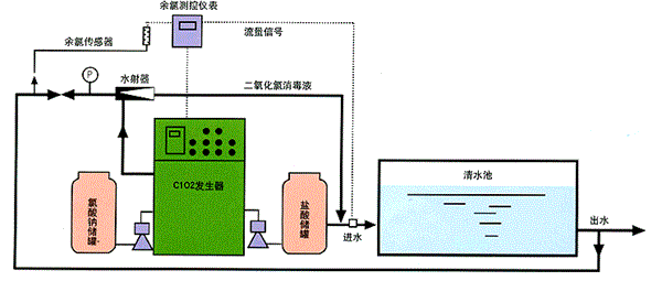 采用鹽酸與氯酸鈉定量注入到反應釜內,反應釜在加熱的情況下發(fā)生化學(xué)反應生產(chǎn)二氧化氯與氯氣,再通過(guò)水射器吸入投加到消毒水體中。工藝采用負壓曝氣、正壓注入的技術(shù)來(lái)生產(chǎn)二氧化氯消毒液。